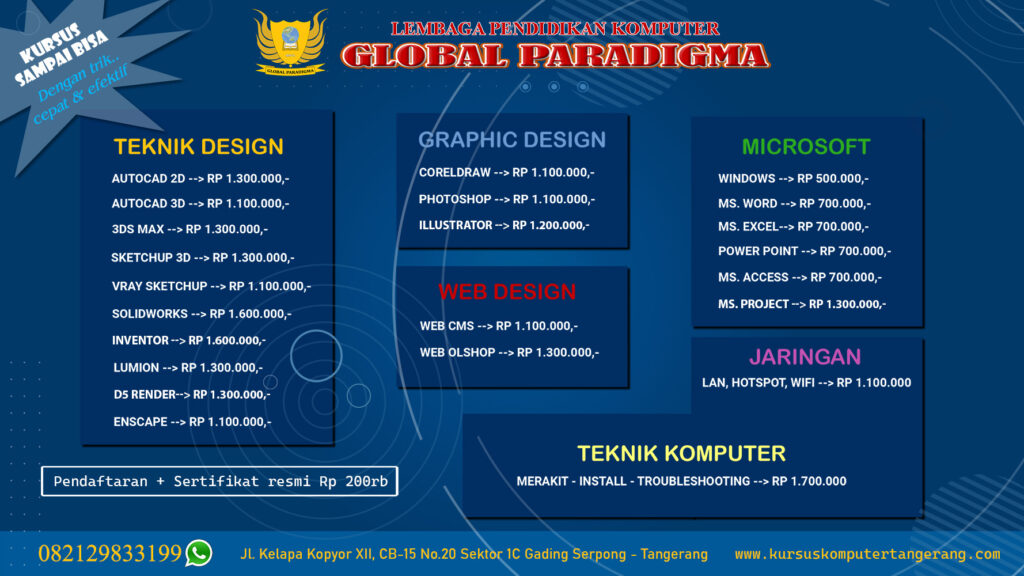 Jangan sia-siakan waktu Anda. Bergabunglah dengan Kursus Komputer Tangerang hari ini dan mulailah perjalanan Anda menuju keahlian komputer yang lebih baik. Hubungi kami sekarang untuk informasi lebih lanjut atau langsung daftar online.